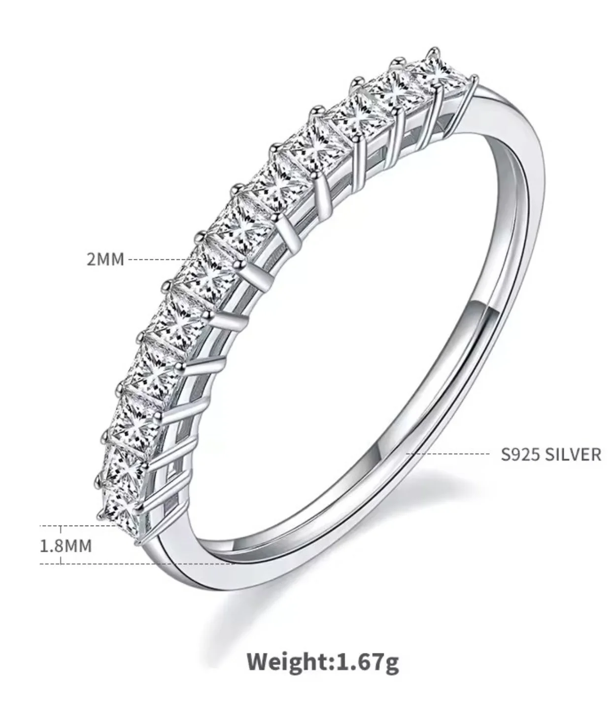 Refined, modern, and intentionally crafted, this princess cut half eternity ring is set in solid sterling silver and adorned with luminous VVS1 princess cut moissanite stones. Each 2mm princess cut stone is expertly cut to enhance brilliance and crisp geometric sparkle, offering a sophisticated look that rivals fine diamonds.